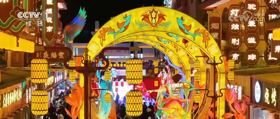 在甘肃敦煌,1200多件特色花灯点亮夜色。从空中俯瞰,灯光连线成片、流光溢彩。20多组主灯融合了飞天、九色鹿、翼马等敦煌壁画元素,成为大家争相合影的打卡点。