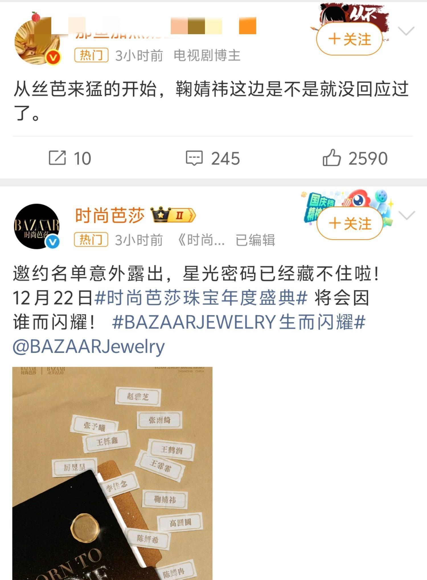不过鞠婧祎完全不受丝芭的影响,从公司突然发难开始到现在一次都没有出来发声,而且今天还官宣参加时尚芭莎珠宝年度盛典了。