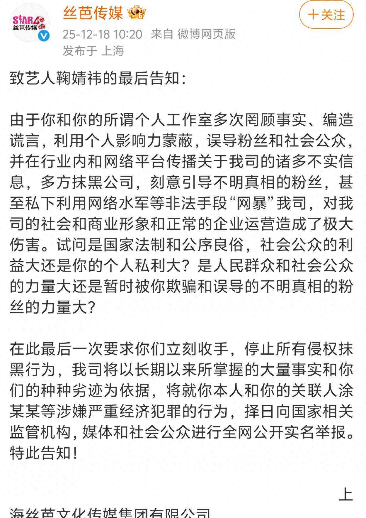 风波升级!丝芭传媒称鞠婧祎涉严重经济犯罪!将公开实名举报!